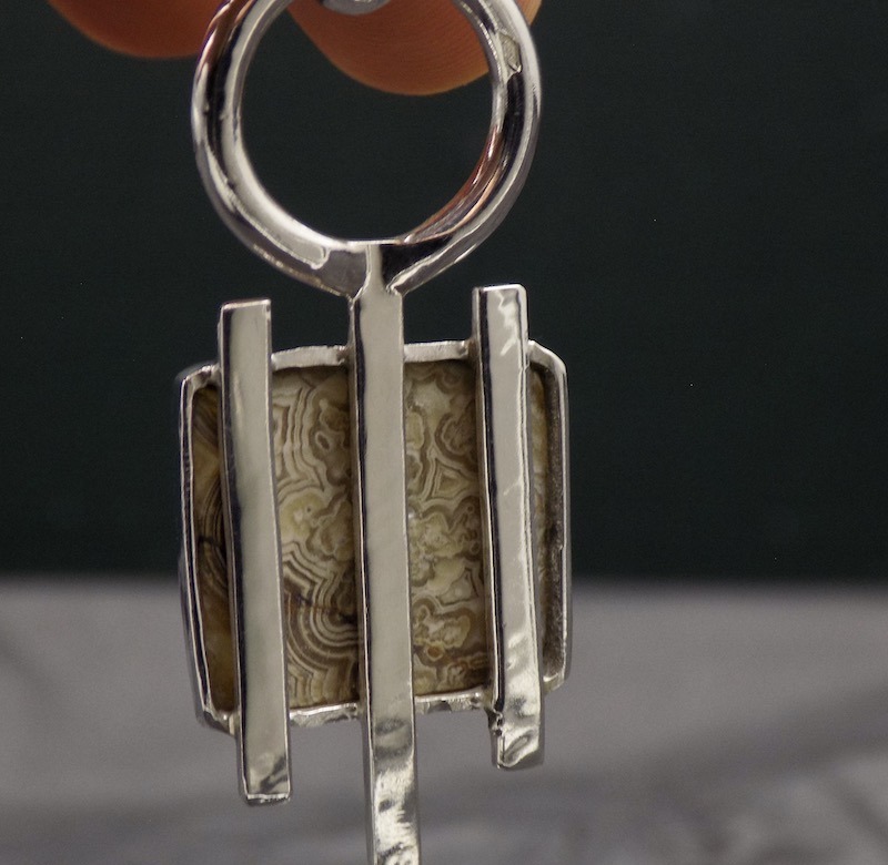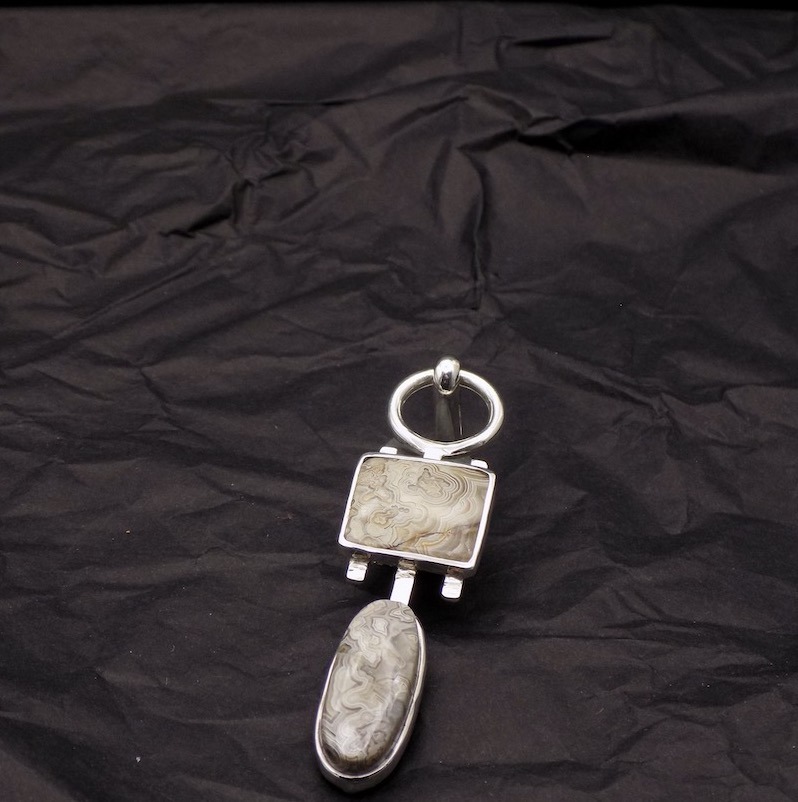 En regardant ces deux pierres, il m’est venu comme évidant de les monter sur un seul et même bijou: le Totem est apparu. Ces deux pierres d’agate crazy lace, l’une ovale, l’autre carrée, se répondent dans un dialogue d’équilibre et de contraste. Leur dessin naturel semble en suspension, comme deux bulles minérales reliées par une même énergie.